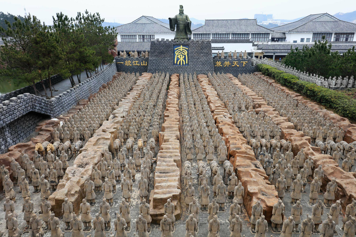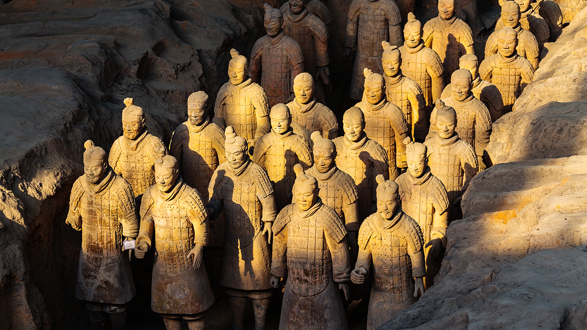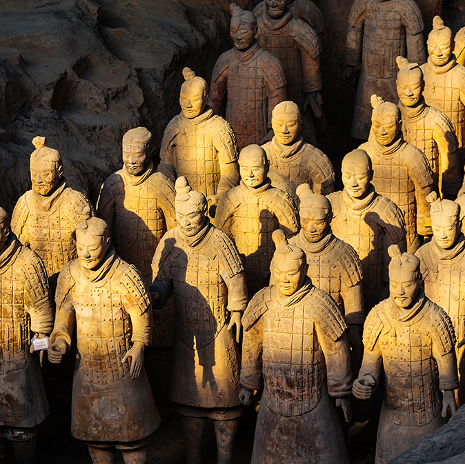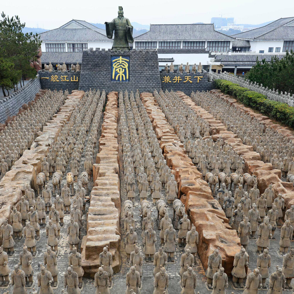 Цинь Шихуанди, первый император, сумевший объединить Китай и основоположник династии Цинь, был одержим идеей победить смерть. Именно поэтому он построил себе небывалую гробницу — огромный подземный город, охраняемый 7-тысячной терракотовой армией в натуральную величину, включая воинов с различными доспехами и оружием, пехотинцев, чиновников, акробатов и музыкантов, а также лошадей и колесницы.